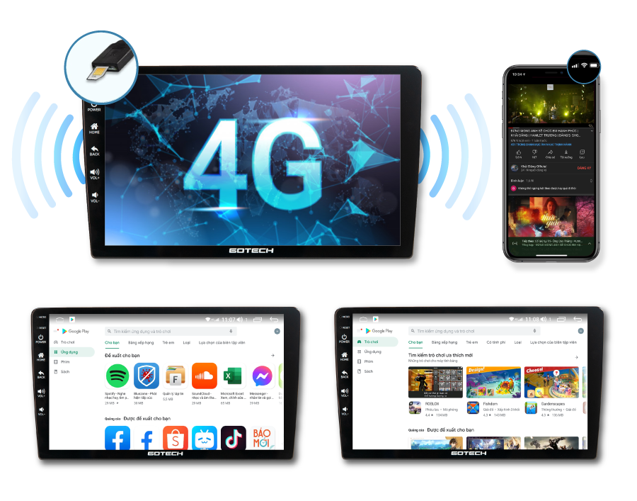 Sử dụng màn hình ô tô GOTECH sẽ biến hóa những khoảng thời gian nhàm chán trên ô tô, sự đợi chờ, những giây phút tắc đường,… trở nên thú vị nhờ vào khả năng kết nối internet 4G. Đây là màn hình android kết nối internet 4G với đầy đủ khả năng của một chiếc máy tính bảng giúp chúng ta giúp chúng ta có những giây phút ý nghĩa khi lái xe.
