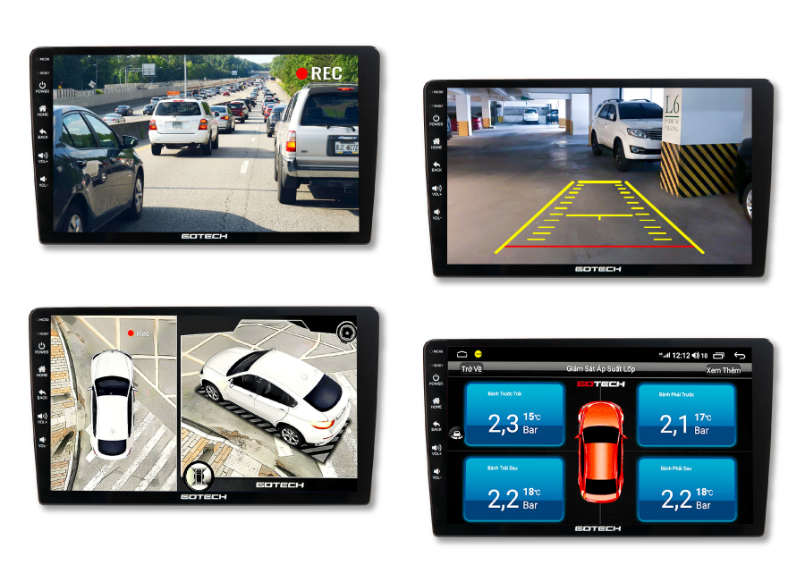 Màn hình ô tô thông minh GOTECH sẽ giúp hỗ trợ các tài xế quan sát dễ dàng tránh va quệt khi lùi hoặc lái xe đường hẹp. Toàn bộ các góc đường bên ngoài xe sẽ được hiển thị full lên màn hình định dạng HD 1280×720 chân thực và sắc nét. Bên cạnh đó, màn hình GOTECH cũng được tích hợp cảm biến áp suất lốp để đưa ra cảnh báo kịp thời nếu tình trạng lốp xe có vấn đề thông qua loa hoặc trực tiếp trên màn hình ô tô.
